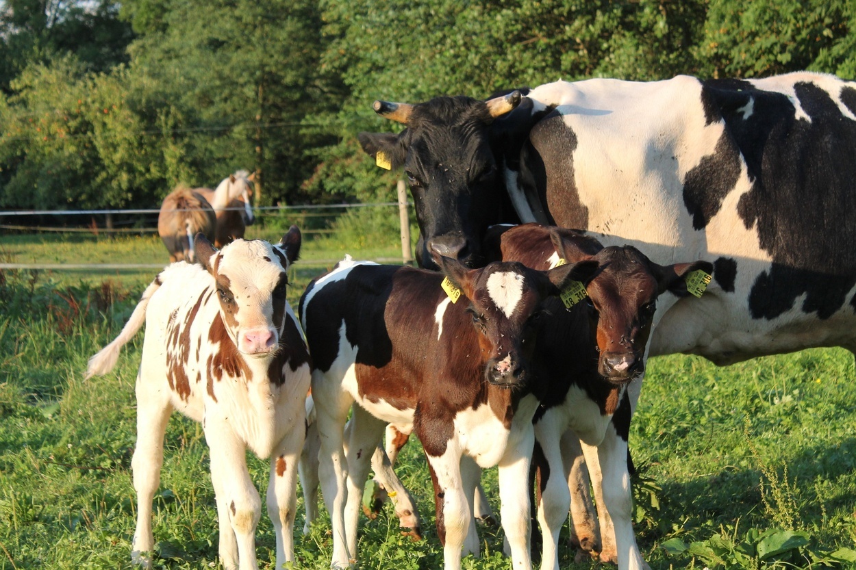 Ruhig gelegener Bauernhof mit vielen Tieren umgeben von saftig grünen Wiesen und einem rauschenden Bach.