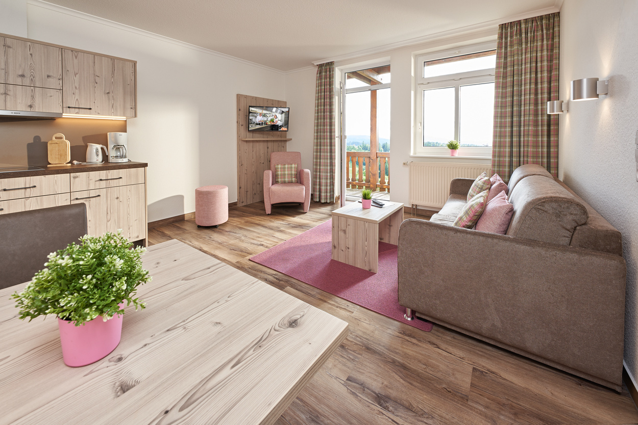 Das Appartement Kandel befindet sich im Haupthaus (1. OG) und verfügt über einen Balkon und ein separates Schlafzimmer, eine Küchenzeile, eine gemütliche Essecke, ein Wohnzimmer mit Sat-TV und ein großes Badezimmer.