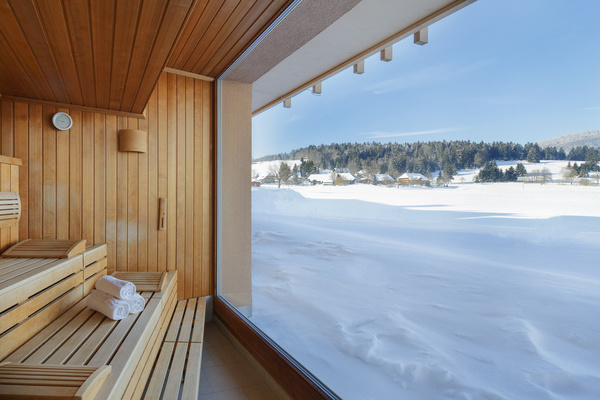 Idyllische Ruhe & endloser Blick über das Hochtal, direkt von einer der Saunen des Hochtal-Spa aus. Mit Mittagsjause, regionalem Gourmetmenü & tollem Service.zum Wellnesshotel