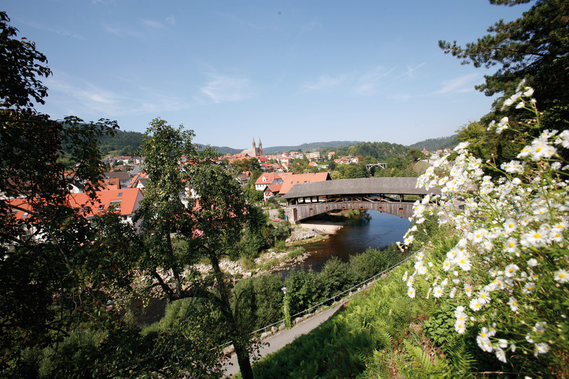 Die überdachte historische Holzbrücke, die größte dieser Art in Europa, ist das Wahrzeichen Forbachs.