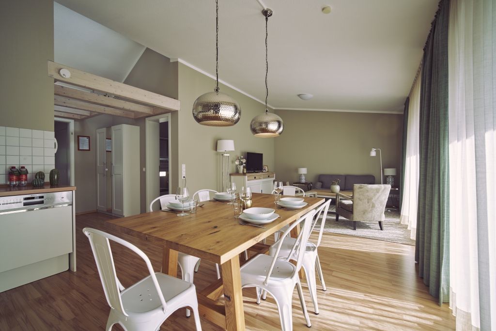 • Wohn & Esszimmer, Küche: Sofa, 2 Sessel, Couch-Tisch, Sat-TV, Esstisch mit 6 Stühlen, Einbauküche, Kühlschrank, Backofen, Spülmaschine, Kaffeemaschine (Filter und Pad), Wasserkocher und Geschirr.