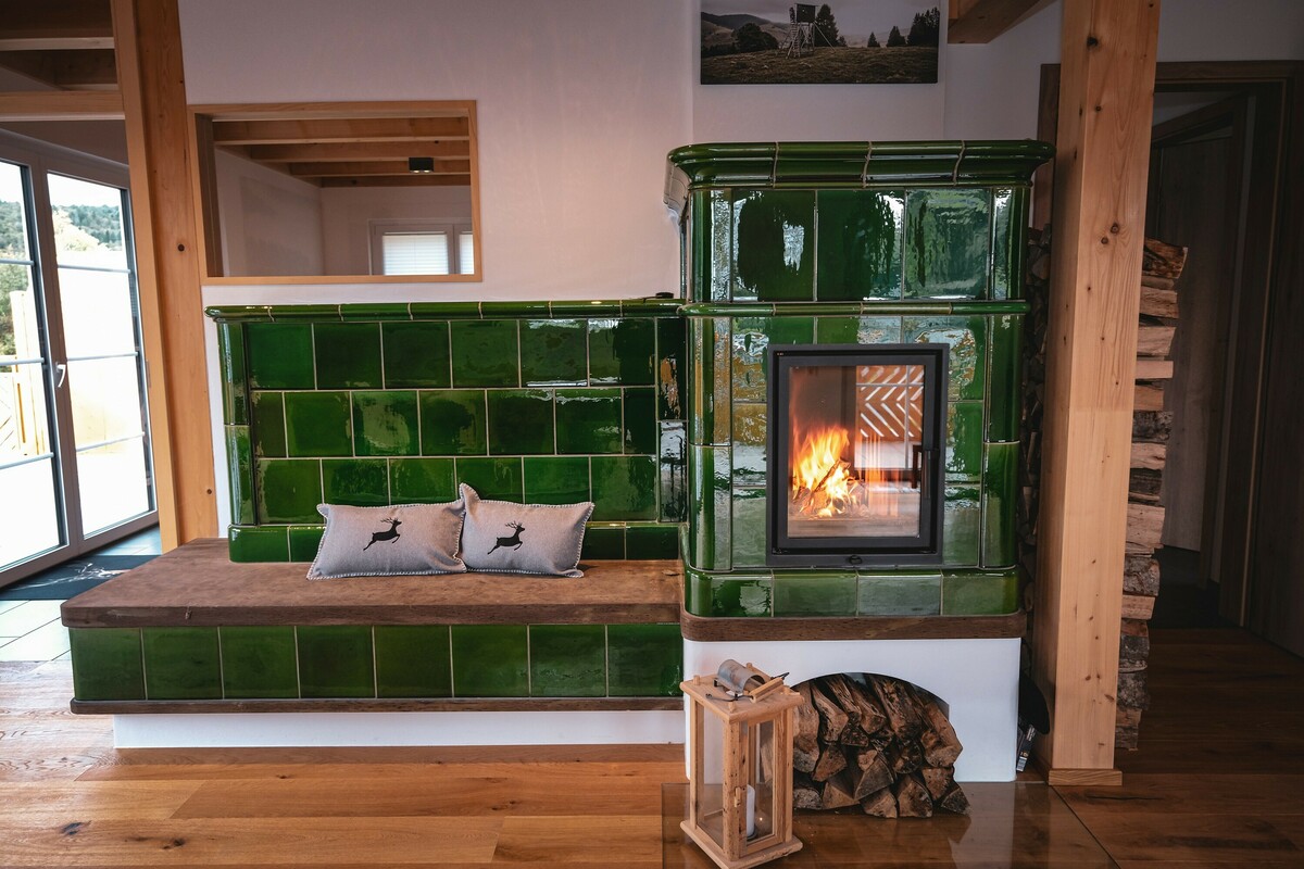 Zum Verweilen lädt das Wohnzimmer mit Eckbank, TV Sitzecke mit Ledersofa und 50“ Flat TV ein. Ein offener Kamin mit Kachelofen und Steinbank sorgen für mollige Wärme an den kälteren Tagen.